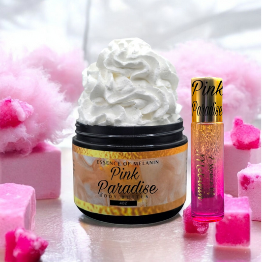 Pink Paradise Body Butter and Roll-On Set. Notes of caramel, raspberry, and musk. This selection...