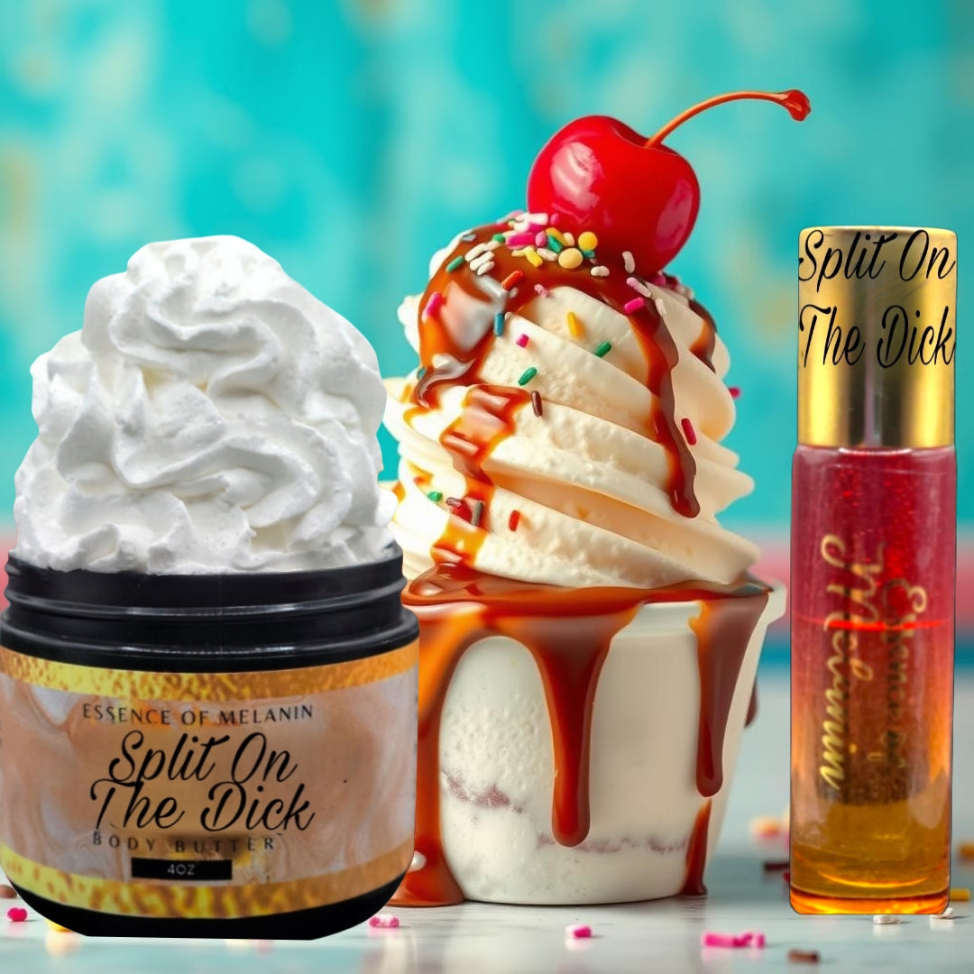 This is not your average body butter and roll-on set! This is a full-blown dessert orgy. Imagine straddling a warm banana split, naked under the neon lights, dripping in thick whipped cream and sticky chocolate. Overripe banana begging to be bitten, hot vanilla cream melting into warm skin, cherry on top just aching to be popped, and thick caramel oozing.